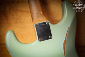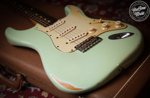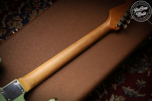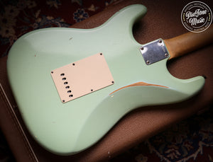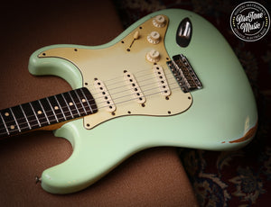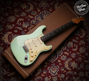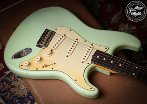Here we have for sale is a lovely Fender custom shop 60s Stratocaster in one of the nicest fender colours Surf Green which as you can see is a lovely example, as you would expect from a custom shop it plays and sounds superb and a joy to play this guitar has had a couple of small changes it has been re-fretted with jumbo frets, the fingerboard radius was 7.25" but it has been professionally changed to a more flat 12" radius, a new correct nut and also the back of the neck has been slightly rubbed to give it more modern playing strat rather than a vintage one.