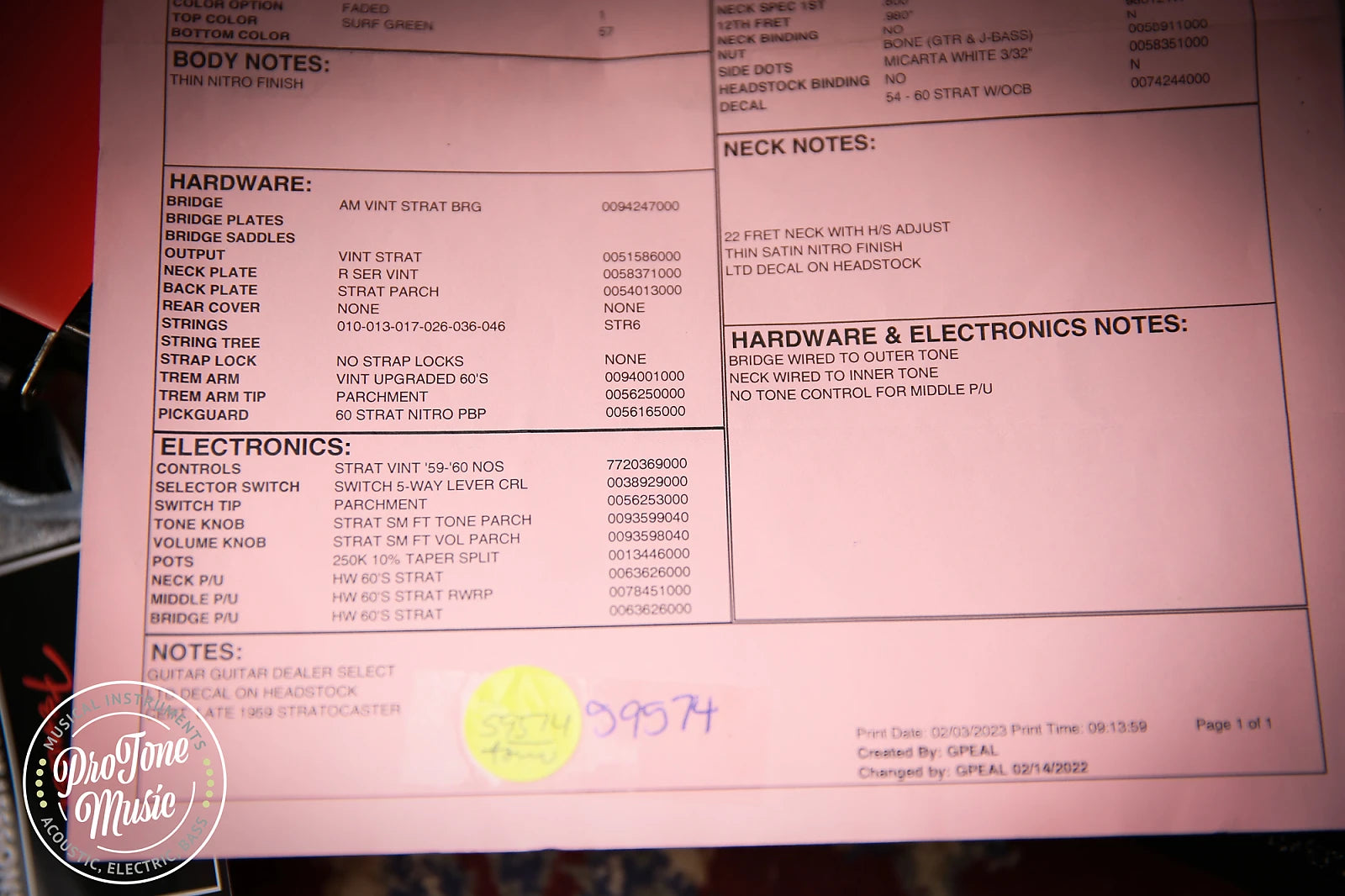Welcome to Protone Music and here we have for sale is another lovely guitar indeed a 2023 Fender USA Custom Shop 59' NOS FSR Dealer Select Stratocaster in Surf Green which as you can see is a lovely example which plays and sounds superb just as you would expect from a custom shop.